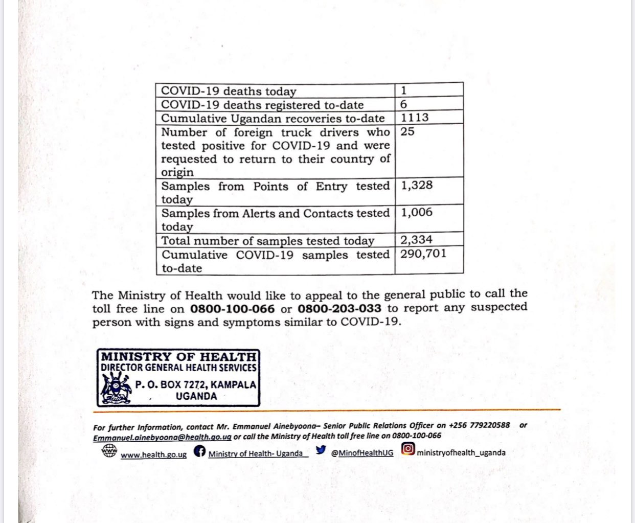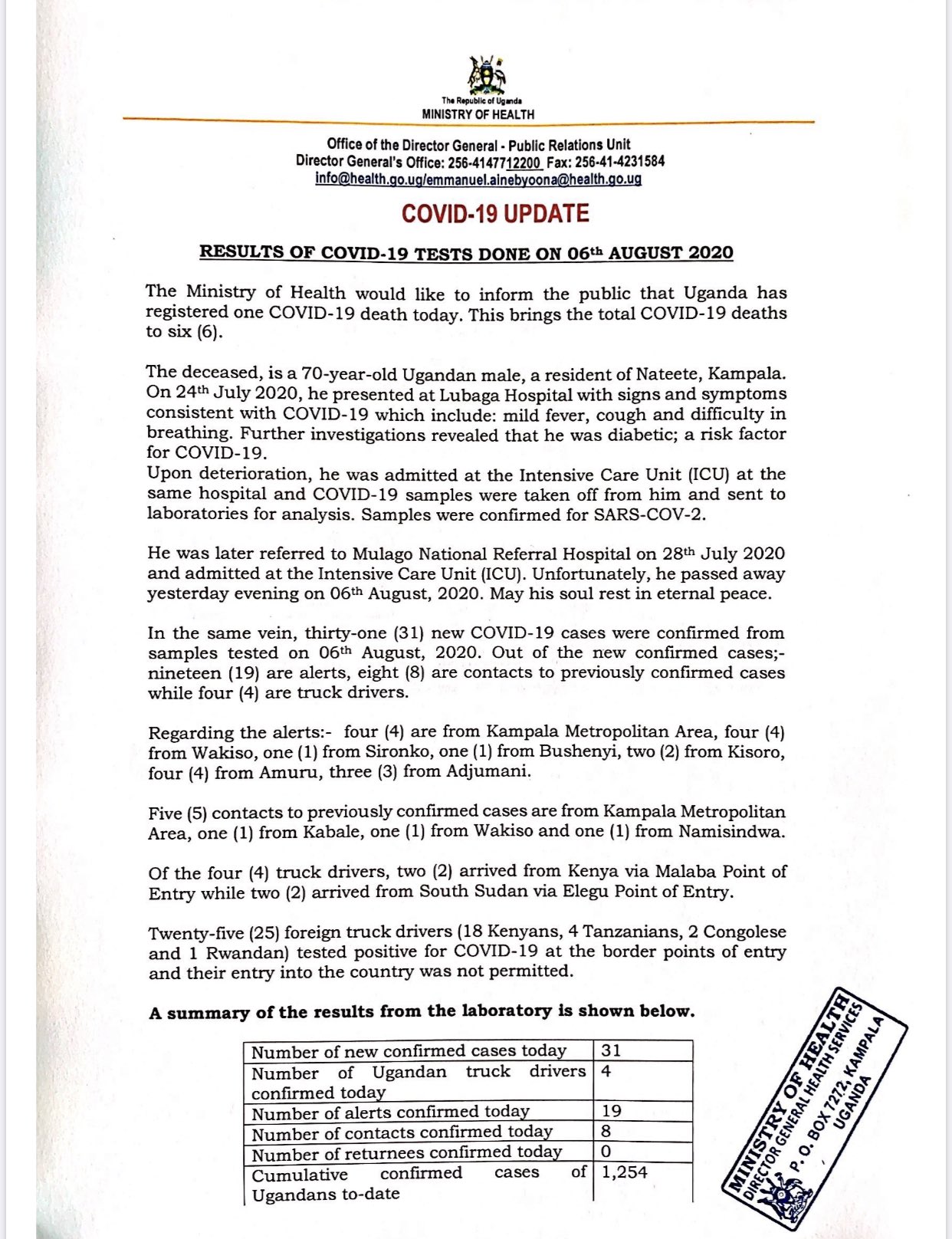 Uganda has registered another COVID-19 death. This brings the total number of deaths to six (6). According to the Ministry of Health the deceased is a 70-year-old Ugandan male, a resident of Nateete, Kampala. Uganda also confirmed 31 new cases of COVID-19. COVID-19-6.jpg COVID-19-6-2.jpg